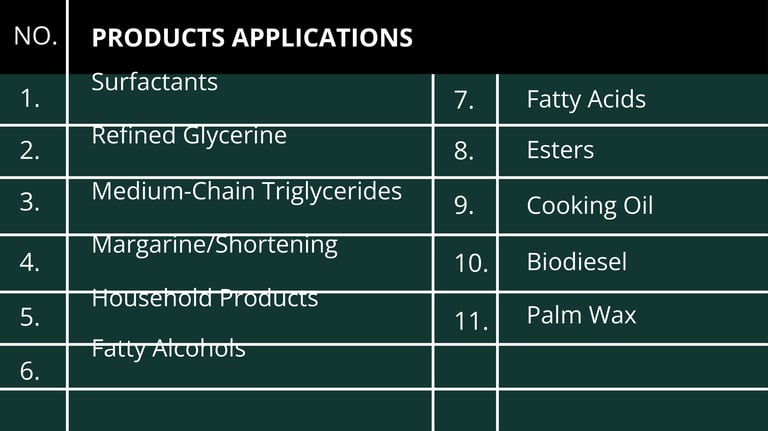 As part of our processing capabilities, CPO is further refined and fractionated into products such as Palm Olein, the liquid fraction commonly used in cooking oil and food manufacturing, and Palm Stearin, the solid fraction widely utilized in margarine, shortening, and specialty fats. Similarly, PKO undergoes processing to produce various oleochemical derivatives for industrial applications.